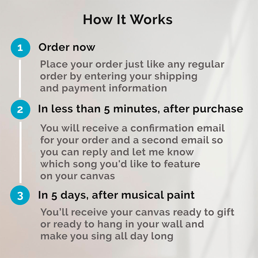 In less than 5 minutes, after purchase. You will receive a confirmation email for your order and a second email so you can reply and let me know which song you'd like to feature on your canvas.