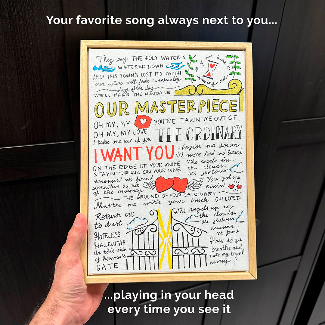 “I cried when I opened it. It was the chorus of our song, painted so beautifully. He absolutely loved it. THANK YOU!” – Sarah G.